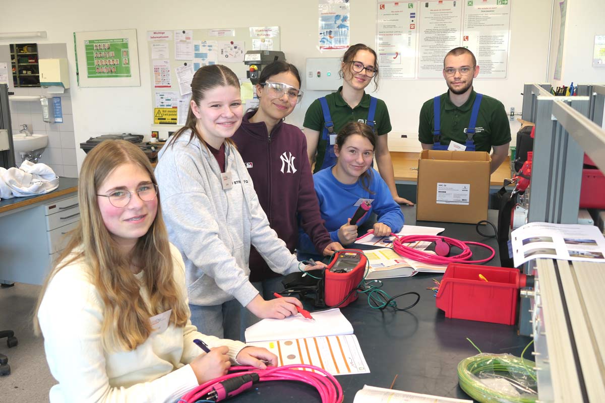 Gemeinsam mit den Auszubildenden aus den Bereichen Elektroniker und Industriemechaniker zeigte die Ausbildungsabteilung des ZMS, wie abwechslungsreich und praxisnah technische Berufe sind. Statt nur zuzuschauen, durften die Teilnehmerinnen selbst aktiv werden: Sie fertigten ein eigenes Verlängerungskabel an, führten Bohrungen durch, verdrahteten den Bausatz „Herzklopfen“ und probierten sich bei Messungen und Lötarbeiten aus.
