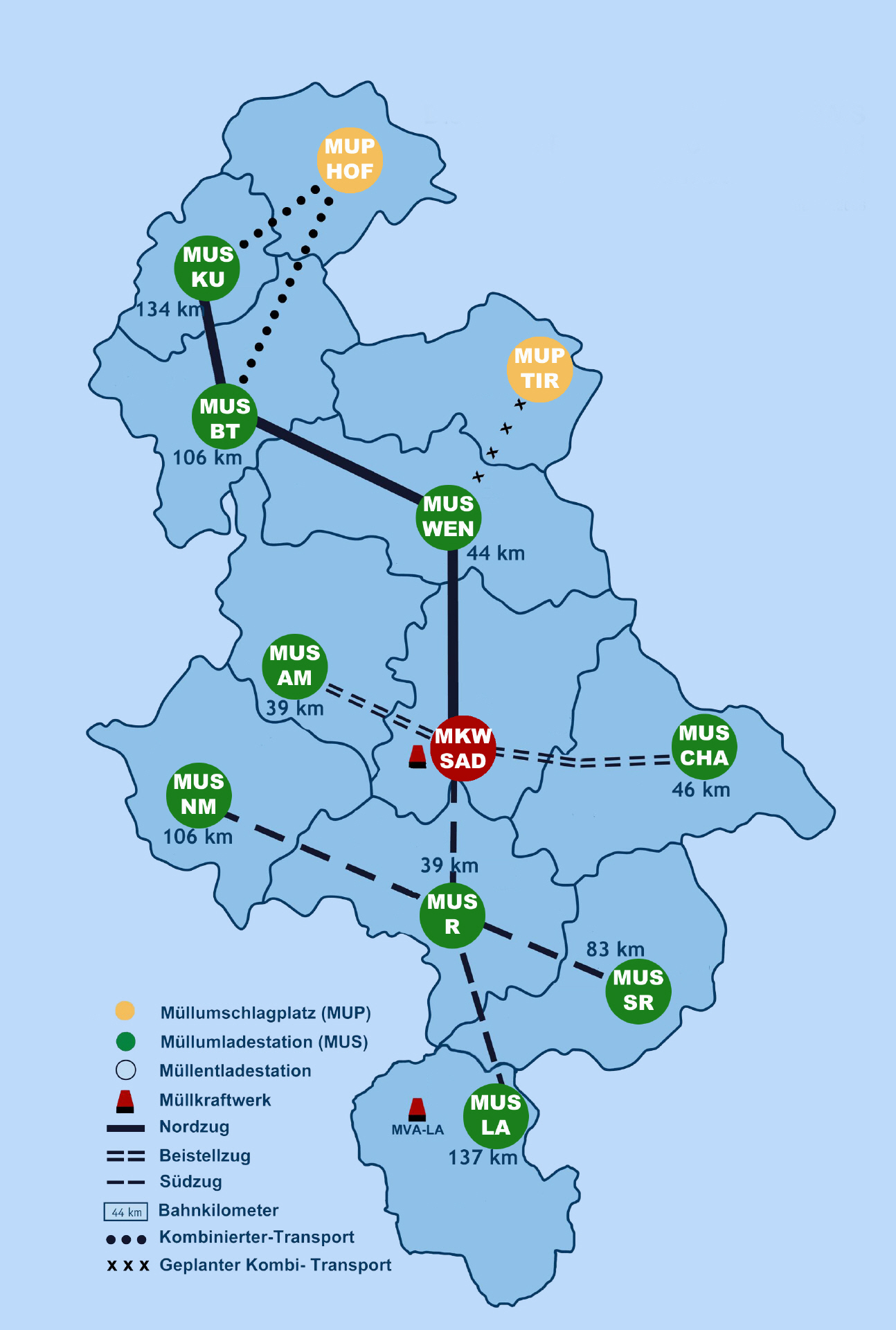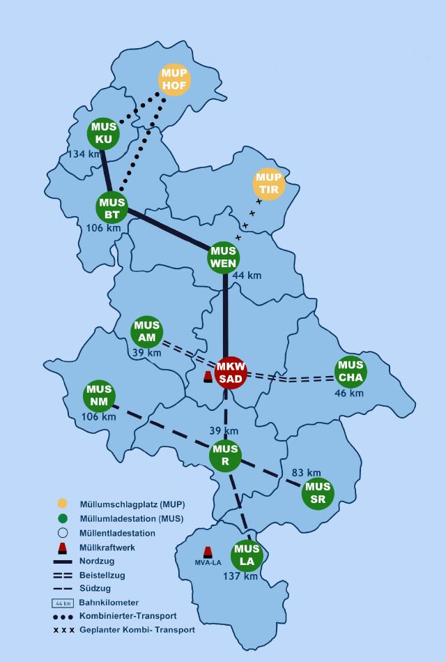 79 Waggons mit 300 geschlossenen Containern sind im Einsatz, um Werktag für Werktag fast 1.500 Tonnen Abfall zum Müllkraftwerk nach Schwandorf zu transportieren. 80 Prozent des im Verbandsgebiet anfallenden Mülls nehmen so den umweltfreundlichen Schienenweg. Nur die 20 Prozent, die aus dem Landkreisen Schwandorf, Tirschenreuth und vom Abfallzweckverband Hof stammen, werden von Müllfahrzeugen via Straße angeliefert.